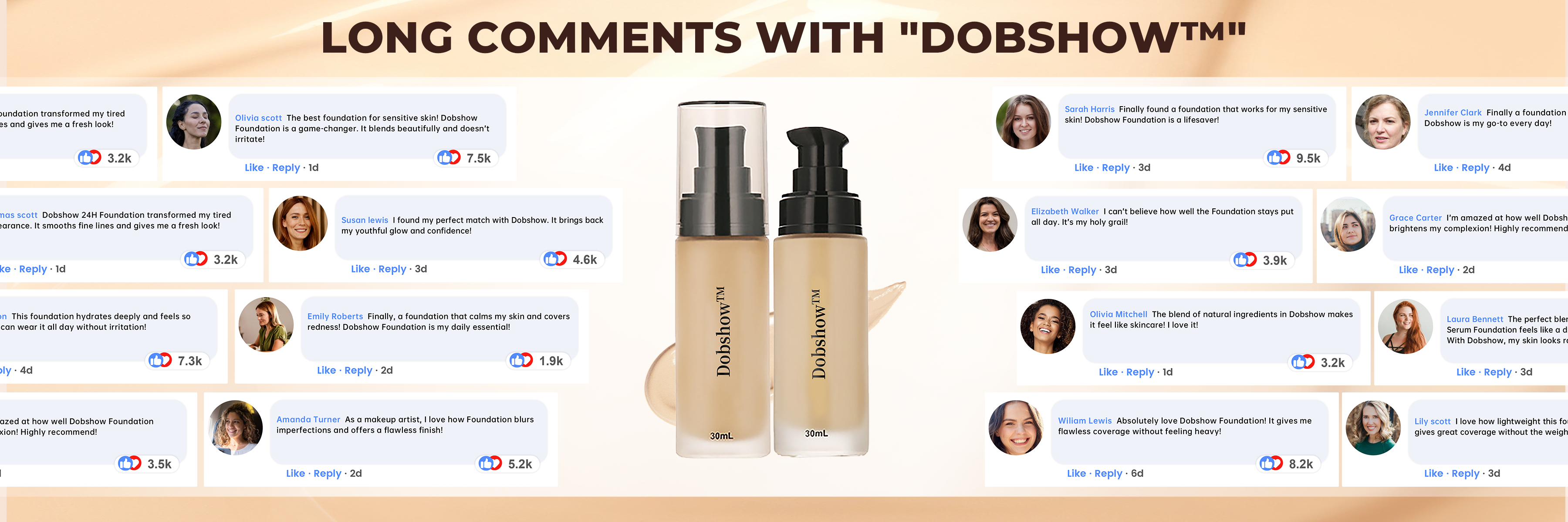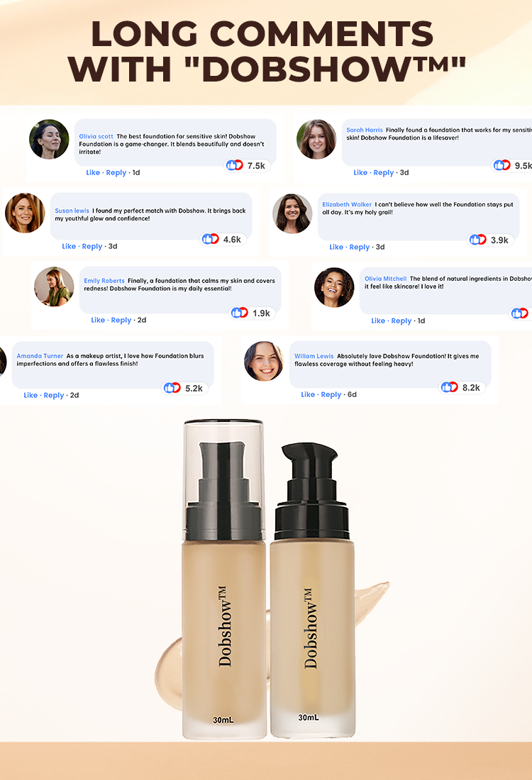 "I’ve always struggled with dry patches and flaky skin, especially around my nose. Every foundation I tried would cling to dry spots and look cakey by midday. But Dobshow foundation is MAGIC! The hyaluronic acid keeps my skin hydrated all day, and it blends seamlessly without emphasizing texture. No more flaky disasters—just smooth, glowing skin. I’m obsessed! " - Sophie Bennett , 31 ⭐️⭐️⭐️⭐️⭐️