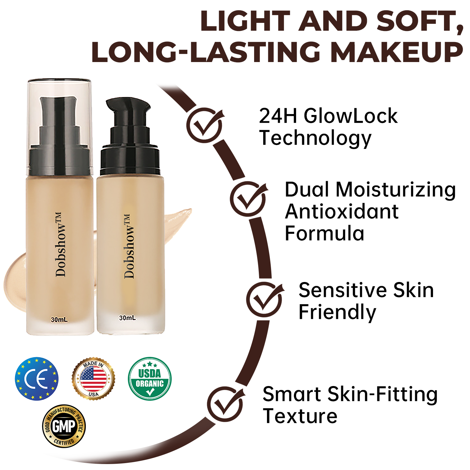 "My T-zone gets oily, but my cheeks are Sahara-dry—finding a foundation that works for both felt impossible. This Dobshow 24H GlowLock Foundation balances everything perfectly! It keeps my shine under control without drying out my cheeks, and the finish is naturally luminous. I don’t even need blotting papers anymore. Finally, a foundation that understands combination skin!" - Hannah Clarke, 29 ⭐️⭐️⭐️⭐️⭐️
